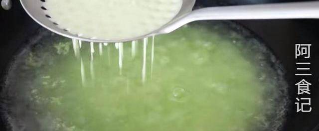 在鍋中燒開水,將黃瓜面糊通過漏勺倒入鍋中。落在鍋裡定後,就像一顆顆綠色的珍珠散落大海,煮熟後撈出來,記得要過一遍涼水,過涼以後,控水放入碗中。