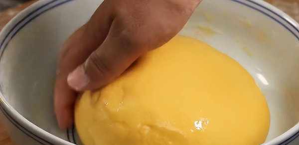 第四步,往南瓜泥裡打入一個雞蛋拌勻,再少量多次的加入面粉,邊加邊攪拌,直到揉成面團。