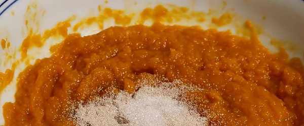 第三步,把南瓜泥放入面盆裡,等其晾至常溫後,加入適量的酵母粉還有白砂糖,拌勻。