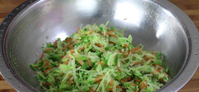 2、起鍋燒水,鍋內水開之後倒入蘿卜絲焯一下水。時間不用很長,水開後煮兩分鐘就可以瞭。蘿卜絲焯完水之後要過一遍涼水,這樣它的口感會更加的好,過完涼水之後,用手擠幹蘿卜絲中的水分,然後放到案板上切碎。切完之後先放到一個幹凈一點的大碗中備用。