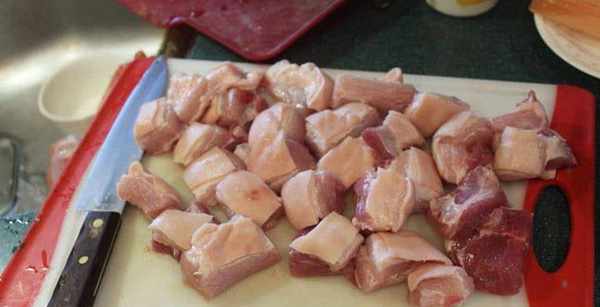 1、把五花肉切麻將大小的塊,沖洗幹凈後,放一湯匙料酒,浸泡一小時。撈出來瀝幹。