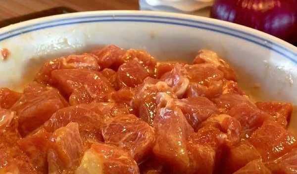 做這道小烤肉,今天我選擇的是豬裡脊肉,裡脊肉不帶一點肥肉,而且肉質鮮嫩,首先我們把裡脊肉表面的筋膜先去除,不要這層筋膜非常硬,咬不動,而且會影響。把去除幹凈筋膜的裡脊肉先切成厚片,厚度大概在一厘米左右,然後把切好的肉片改刀切成小的正方塊兒。肉塊兒不能切太大,不然不容易入味,而且也不容易熟,隻要把肉塊兒切成像我們這樣大小就可以瞭。