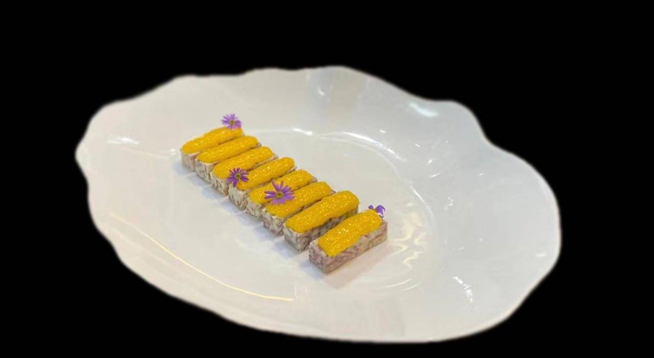 把切好的香芋塊放入蒸箱蒸20分鐘,擠上用煉乳、白糖、蛋黃醬、濃縮橙汁、金桔汁、焦糖佈丁粉混合成的醬,再在上面放上適量的杏仁片。