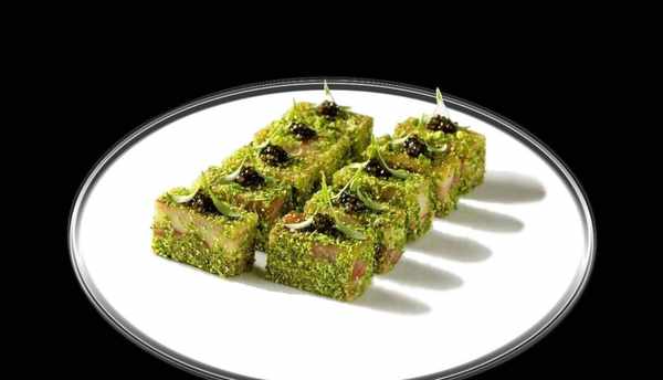 隔天取出豬手切成大小均勻的方塊,把幹秋葵用料理機打碎成粉,切好的豬手裹上秋葵粉裝盤即可。