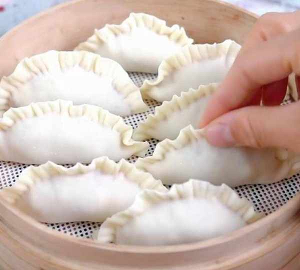 第5步、包餃子。今天用的直接買的餃子皮,先把餃子捏起來,然後用大拇指和食指一個向後推,一個向前推,就能捏出好看的花邊瞭。