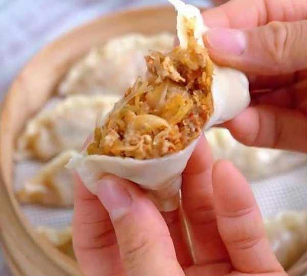 外皮超級薄,隱隱約約就能看到裡面的內餡,皮兒薄餡兒多,說的就是這個泡菜餃子,吃起來酸辣爽口,裡面的辣白菜吃起來非常爽脆的,特別過癮。
