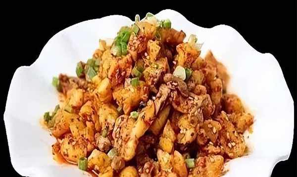2、把雀胗與蘿卜幹一起納盆,加放花椒面、香醋、紅油辣椒和熟芝麻拌勻,裝盤並撒上蔥花便成菜。