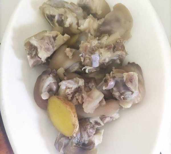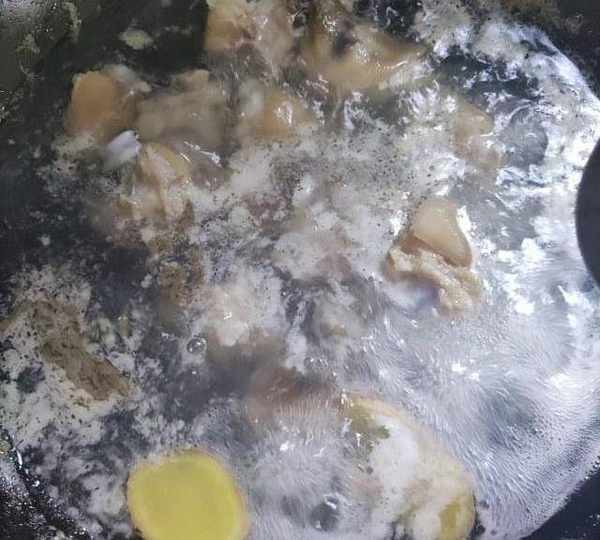 第1步、豬蹄剁塊冷水下鍋,加入2片薑片少許白酒去腥。