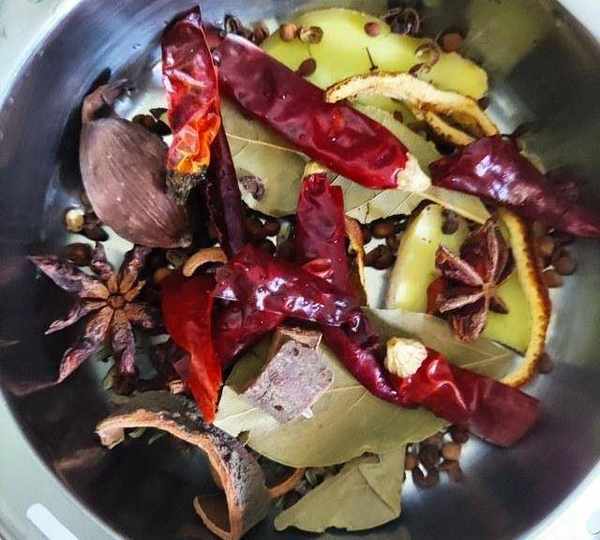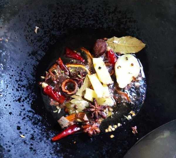 第6步、油燒熱後,調成小火放入佐料翻炒出香味。