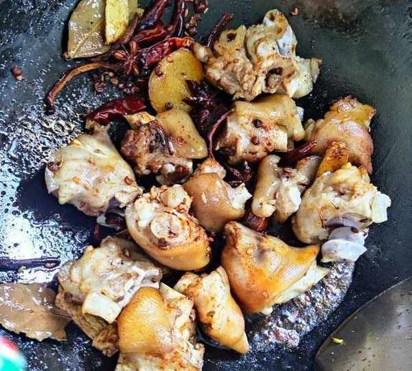 原料:豬蹄、花生米、幹辣椒、草果、香葉、八角、桂皮、花椒、陳皮、白砂糖、老抽、生抽、白酒、生薑、小蔥、蠔油、食用油、鹽。