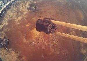然後加入開水倒兩倍的水量燒開,小火慢燉,燉一個小時後放入鹽,豆腐乳把搗碎繼續燉到肉差不多瞭爛瞭就大火收汁我差不多燉瞭兩個小時多(有高壓鍋的可以用高壓鍋燉,燉完倒入鍋裡加入鹽和豆腐乳繼續煮一小會然後給它收汁)