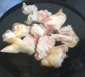 豬蹄冷水下鍋煮開撇去浮沫,煮個幾分鐘的。撈出瀝幹水份備用。
