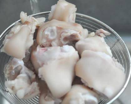 第1步:清洗豬蹄。先把豬蹄剁成小塊,然後沖洗幹凈。放入鍋中加入料酒,生抽,食用鹽,再放入一些蔥白和生薑片攪拌均勻,醃制入味。然後在鍋中加入適量的清水,放入適量的桂皮和香葉。水煮沸騰之後,把豬蹄煮5分鐘左右出鍋。用漏勺撈出來,然後放在水龍頭下沖洗幹凈,因為上面有一些浮沫。