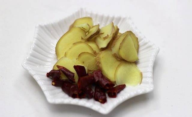 生薑切成片,幹辣椒剪成段。