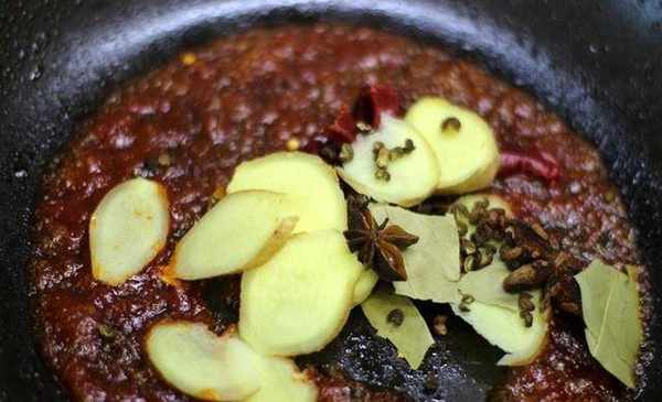加入薑片、八角、香葉、花椒、幹辣椒段,翻炒