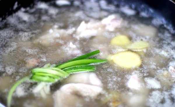 豬蹄入鍋焯水,小蔥打結後加入,加入適量薑片、料酒,中途撇去浮沫,然後將焯好水的豬蹄用熱水沖洗一下。