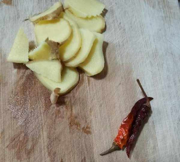 第2步、準備幾片薑和小辣椒幹,喜歡吃辣的可以多加幾個幹辣椒。