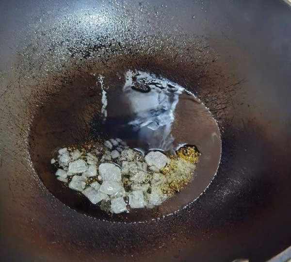 第4步、起鍋燒油,下冰糖粒,小夥熬到糖融化,成淺咖啡色。