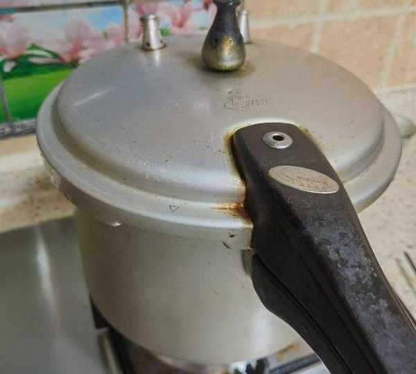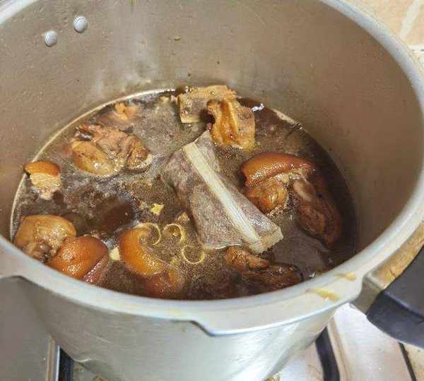 第10步、轉入高壓鍋,加入胡椒粉(因為要撇去浮沫,不能太早下胡椒粉)。如果沒有高壓鍋,就在炒鍋裡中小火燒煮45分鐘,轉小火10分鐘至豬腳軟糯。