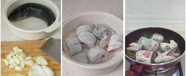 2.將黑魚切成段,抹上少許鹽、料酒後醃制10分鐘,然後給每個魚塊裹滿幹面粉。