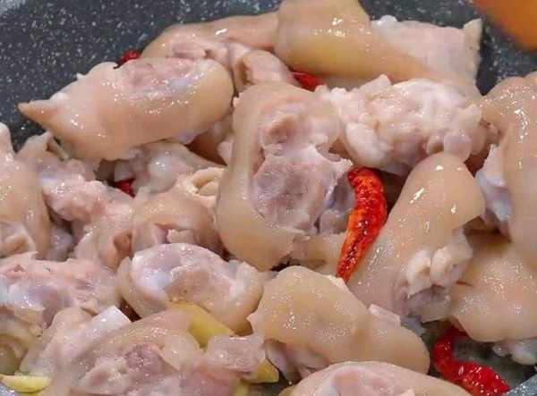 6、再放入焯過水的豬腳,隻有焯過水的豬腳吃著才不會膩,把豬腳炒至表皮微黃。