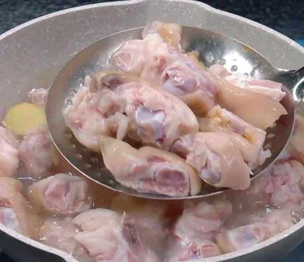 4、水開把飄著的沫撈出,把豬腳撈出過水清洗幹凈,裝入盤中備用。