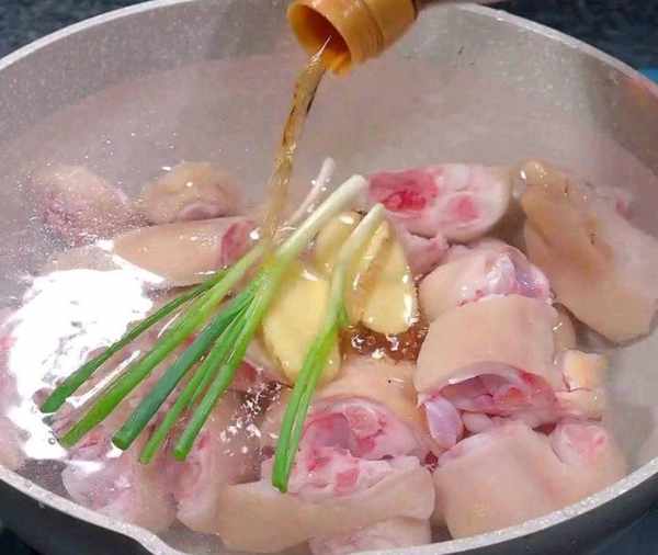 3、剁好塊的豬腳冷水下鍋,鍋裡放蔥、薑、料酒去腥味。
