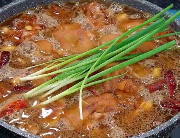 8、炒出醬香後倒入半瓶啤酒提鮮,再加入適量的清水,水要沒過豬腳,再放上幾根小蔥,蓋上鍋蓋燉一個小時。