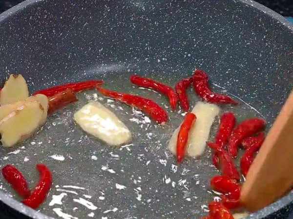 5、起鍋燒油,放入生薑、桂皮、幹辣椒,開小火一起炒香。