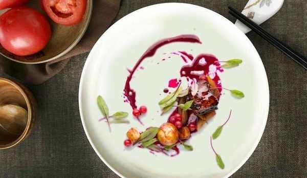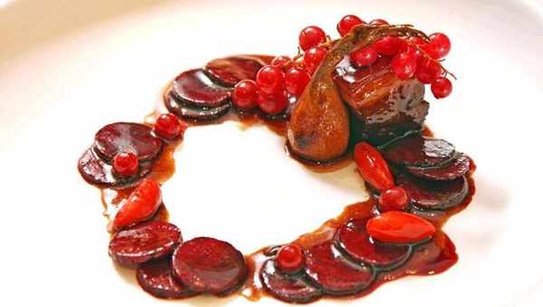 五花肉留底湯加入茨菰大火收汁,擺入紅菜頭片成圓圈狀,放入紅燒肉塊、茨菰、紅加侖,撒入蔓越莓即可。