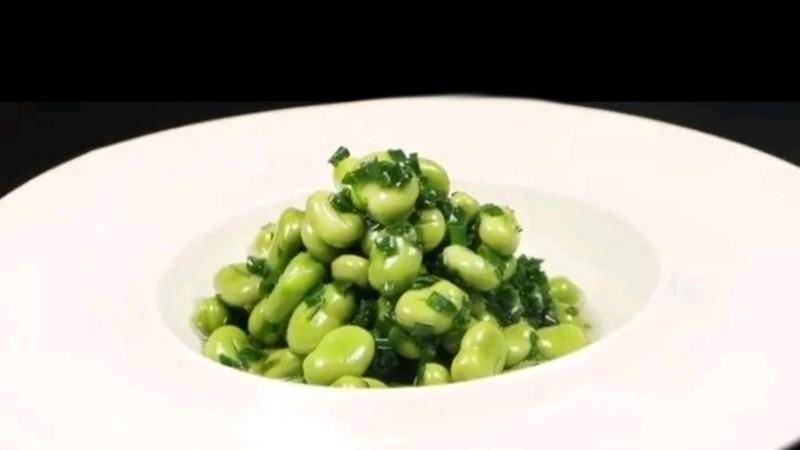 把蠶豆改刀後飛水,撈出放入冰水中冰鎮。
