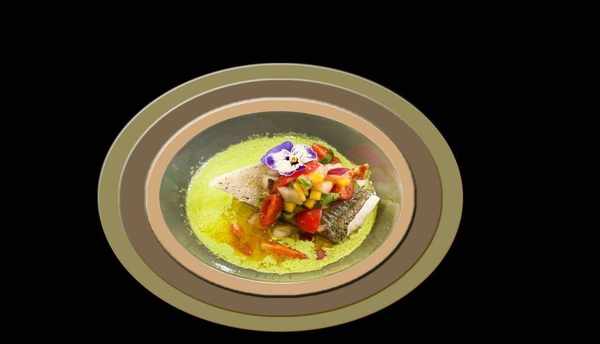 海鱸魚、芒果丁、聖女果、洋蔥、羅勒、香菜、百裡香、大蒜、黃油、菠菜、培根、蘑菇、大蒜、橄欖油、鹽、胡椒粉、蜂蜜、孜然、薑黃、白酒醋、芝麻油、辣椒油