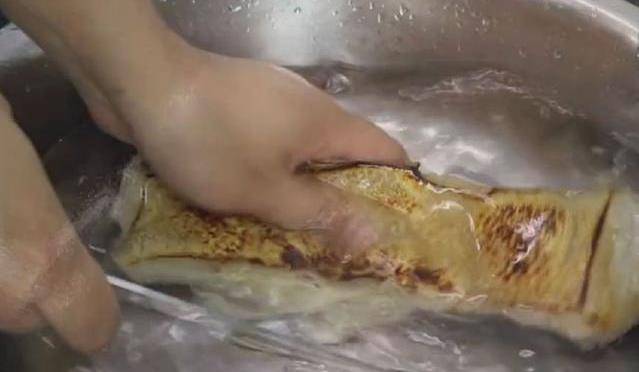 2.將烙好的五花肉倒入清水的盆中,用刀將豬皮刮洗幹凈。