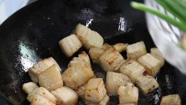 5.鍋中放入少許食用油,倒入五花肉開小火慢炒。