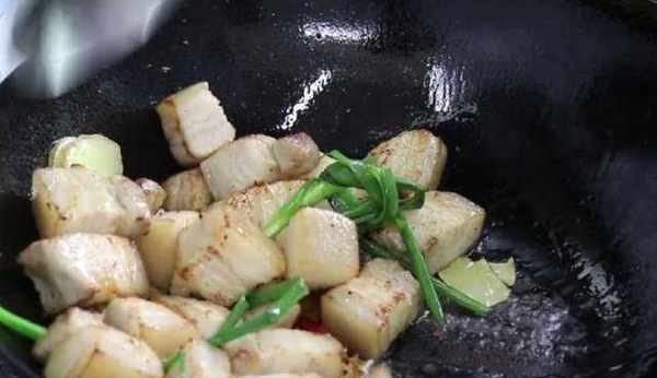 6.炒至五花肉開始吐油時,下入蔥結、生薑、八角、香葉、桂皮、花椒、幹辣椒炒出香味。