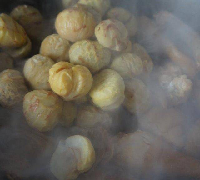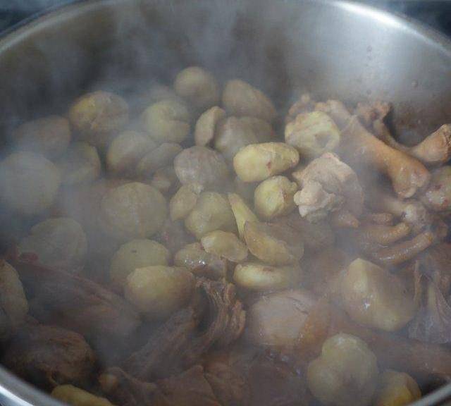 第9步、再次蓋上蓋子燉煮10分鐘,打開蓋子,板栗盡量不要翻動,以免碎瞭。