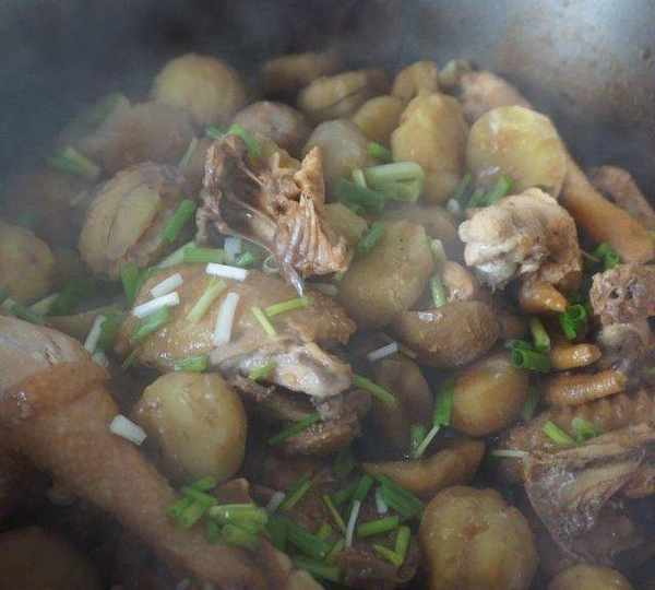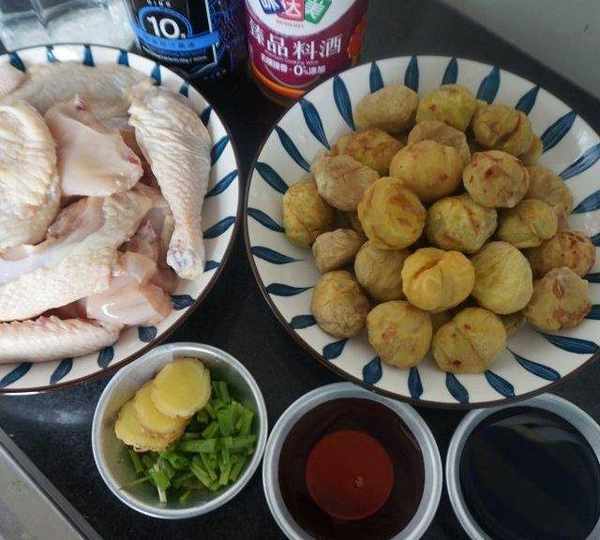 原料:童子雞、板栗、生薑、小蔥、醬油、料酒、水。