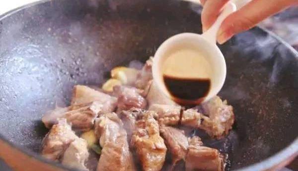 4、待鼻子聞到香味,下入排骨和醬油繼續翻炒均勻,加入清水(水剛漫過排骨即可)