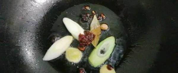 3、接著鍋內刷洗幹凈,放入底油,下入生薑蔥和八角,不斷的炒出香味(一定要炒出生薑蔥的香味,這樣煸炒生薑蔥才有意義)
