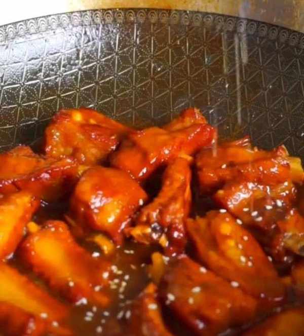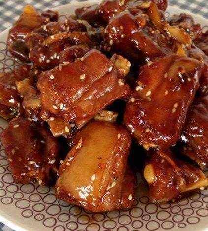 第四步,排骨熟瞭,出鍋前放點芝麻,就可裝盤開吃咯