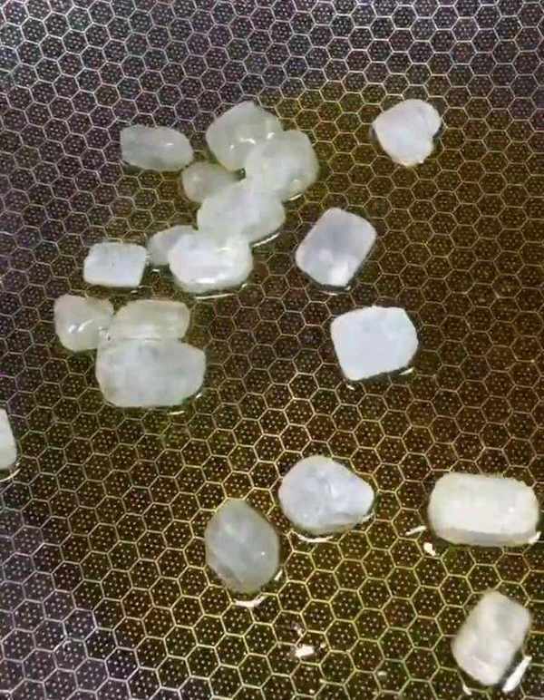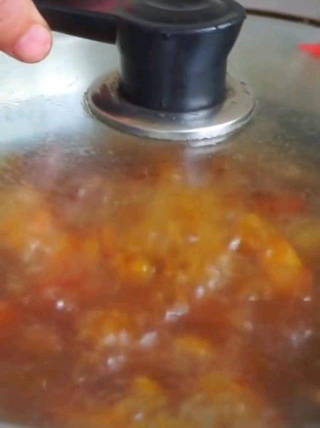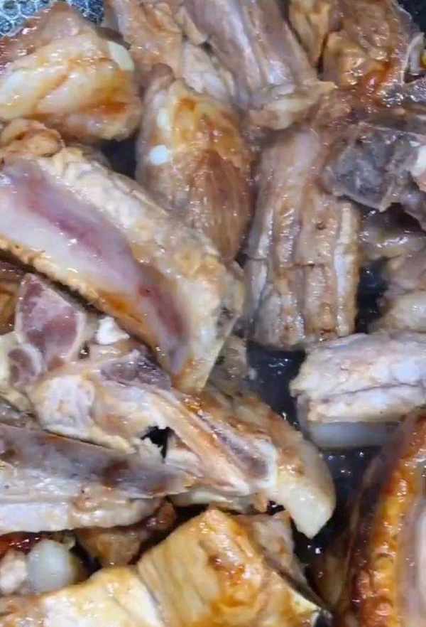 第二步,另外起鍋燒油,開小火,先放入冰糖,用勺子快速翻拌,熬至冰糖融化,然後倒入排骨,翻炒幾下,上色後,加入清水。