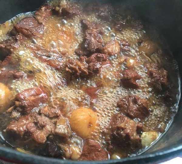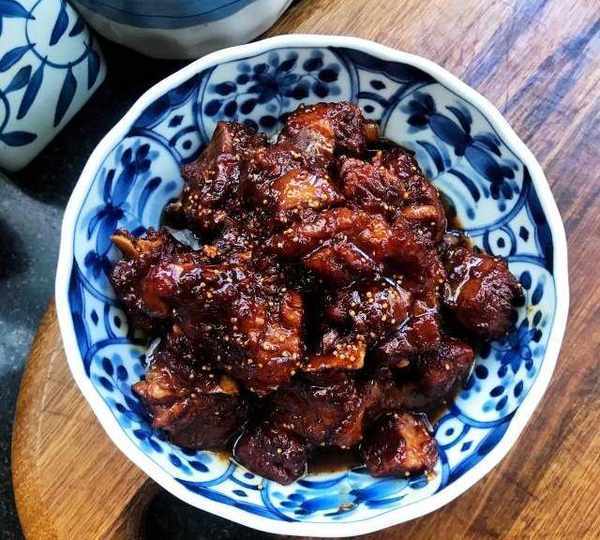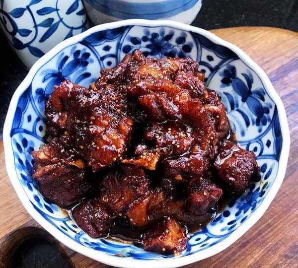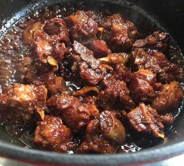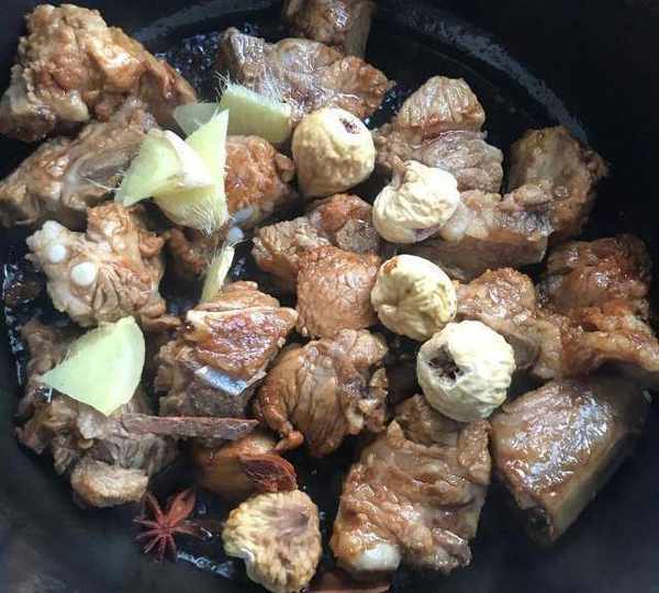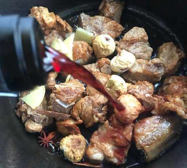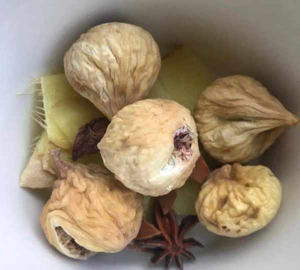 原料:排骨、無花果幹、紅酒、薑、八角、桂皮、冰糖、花椒、油、鹽、老抽、醬油、醋、開水。