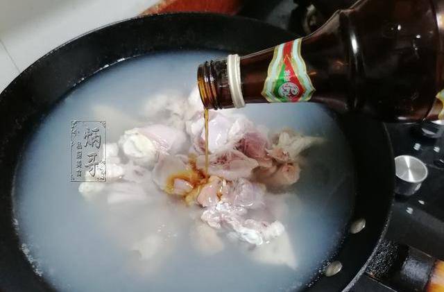 3、準備好以上食材之後,我們就可以開始起鍋熱水瞭,先取出一口幹凈的鍋,隨後往鍋內倒入適量的清水,開大火候將鍋內的水煮開之後,我們就將切好的雞肉放到鍋內焯出多餘的血水以及雜質,再倒入適量的料酒去腥。