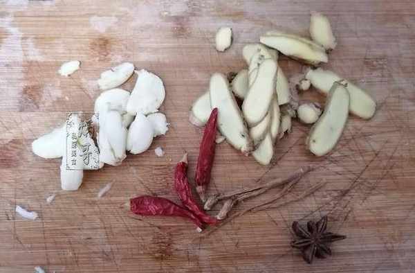 2、生薑洗凈之後切成薑片。大蒜去皮洗凈直接拍碎、辣椒洗凈即可。再準備適量的八角和桂葉用清水沖洗幹凈,我們等會要用到。