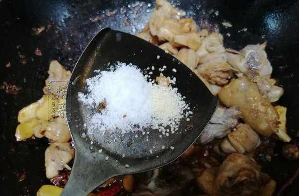 8、將鍋內的雞肉都炒上醬油的顏色瞭之後,我們再依照自己口味的咸淡撒入適量的食鹽和味精提味。將鍋內的味精和食鹽翻炒均勻。