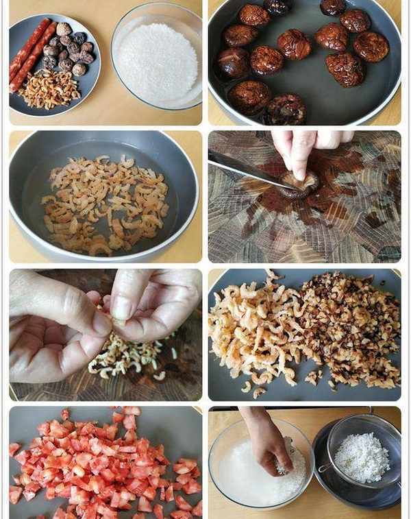 1.準備食材:糯米(要提前用溫水泡30分鐘左右),幹香菇,幹蝦仁,廣式臘腸