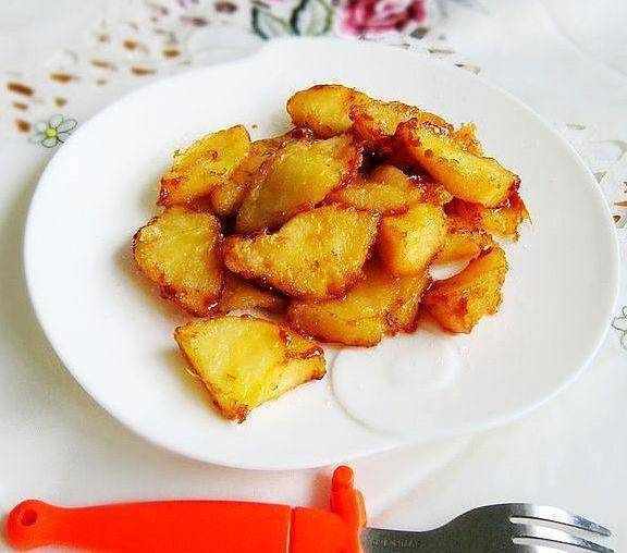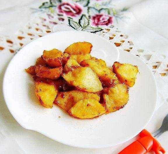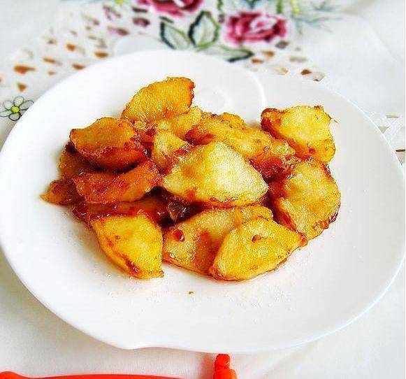 2、要小火炒制白糖,炸好的蘋果塊要復炸一次(可選),盡量讓所有的表面都變硬