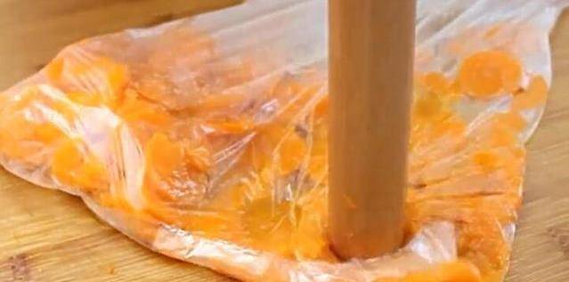 3、十五分鐘以後,把蒸好的胡蘿卜取出來,稍微放涼,然後裝進一個幹凈的保鮮袋裡,用搟面杖把胡蘿卜搗成泥。
