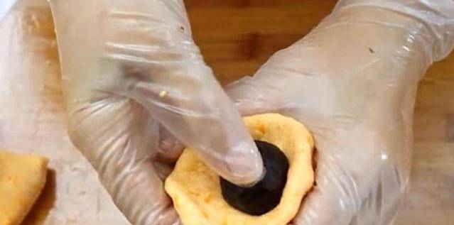 7、取其中一個面劑子,放在手裡搓圓再按扁,捏成邊緣薄中間厚的面皮,放入一個準備好的豆沙球,用虎口處收口,捏緊。