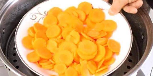 2、把切好的胡蘿卜片裝入盤子裡,蒸鍋中倒入適量的清水,胡蘿卜冷水上鍋,蒸15分鐘左右,蒸熟。